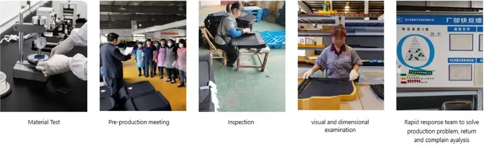 当社はカーマットの設計と製造については ISO9001、品質管理については ISO/TSI16949、環境管理については ISO14001:2015、社会的責任については BSCI、原材料については EU REACH 規格に完全に準拠しています。 当社には、当社の製品が SGS、Intertek、または顧客が要求するその他のサードパーティ検査機関によって実施されるテストに合格することを確認するためのセルフチェックを実行するための社内テスト施設があります。