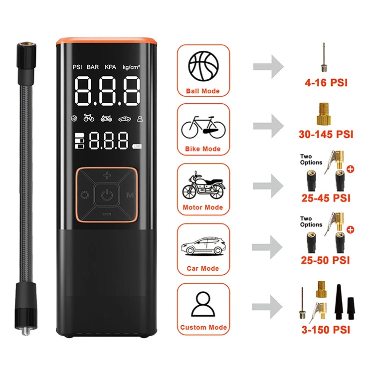 圧力単位: PSI、KPA、BAR、KG/CM²、および 4 つのプリセット膨張モード。車両に合わせて4つのプリセットモードの圧力を設定できます。このエアポンプは次の用途に適しています。